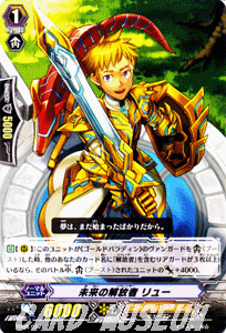 ■収録:TD 第8弾「聖域の解放者」 ■カード名:未来の解放者 リュー ■グレード:1/スキル:ブースト ■種別:ノーマルユニット/トリガー:- ■クラン:ゴールドパラディン/種族:ヒューマン ■シールド:5000/国家:ユナイテッド・サンクチュアリ ■パワー:6000/クリティカル:1 【効果】 【自】【R】:このユニットが《ゴールドパラディン》のヴァンガードを【ブースト】した時、他のあなたのカード名に「解放者」を含むリアガードが3枚以上いるなら、そのバトル中、【ブースト】されたユニットのパワー+4000。