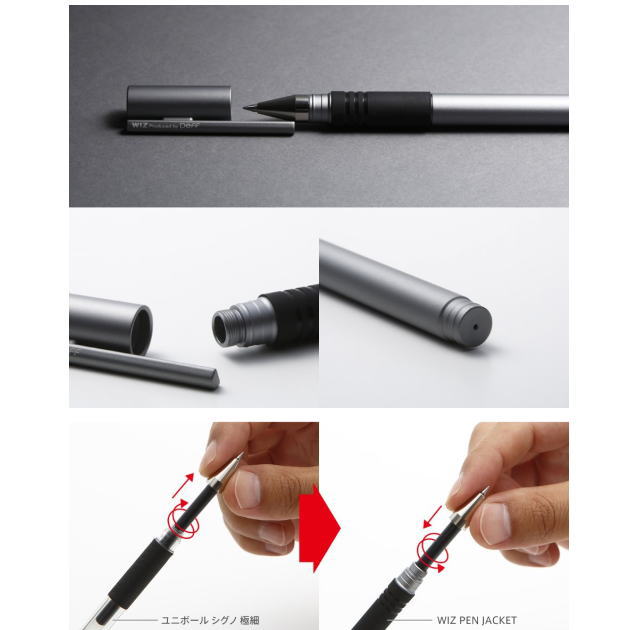 新ブランド「WIZ」初のステーショナリーアイテムとなる「WIZ PEN JACKET」は、取り外した「ユニボール シグノ 極細」シリーズの口金とリフィルを挿し込んで装着するアルミ製のジャケットです。